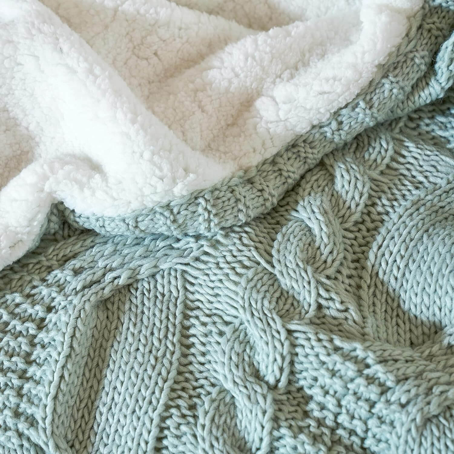 PREMIUM MATERIALS: Made of a 58% acrylic 32% polyester 10% wool knit one side and 100% polyester Sherpa the other side, this Sherpa Fleece cable knit throw is the warmest and comfiest thing you've ever tried. Not only it looks and feels amazing, it's also very durable and easy to maintain. We recommend washing in cold water with a gentle detergent (no fabric softener). Tumble dry on your lowest dryer setting with low heat (do not iron).